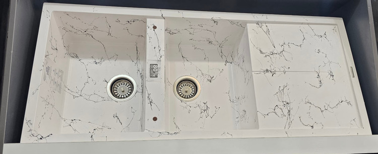سینک گرانیتی رونی پلاس مدل سفید طرح سنگ با رنگ خاص سفید رگه مشکی انتخابی ایدهآل برای آشپزخانههای مدرن و مینیمال است.